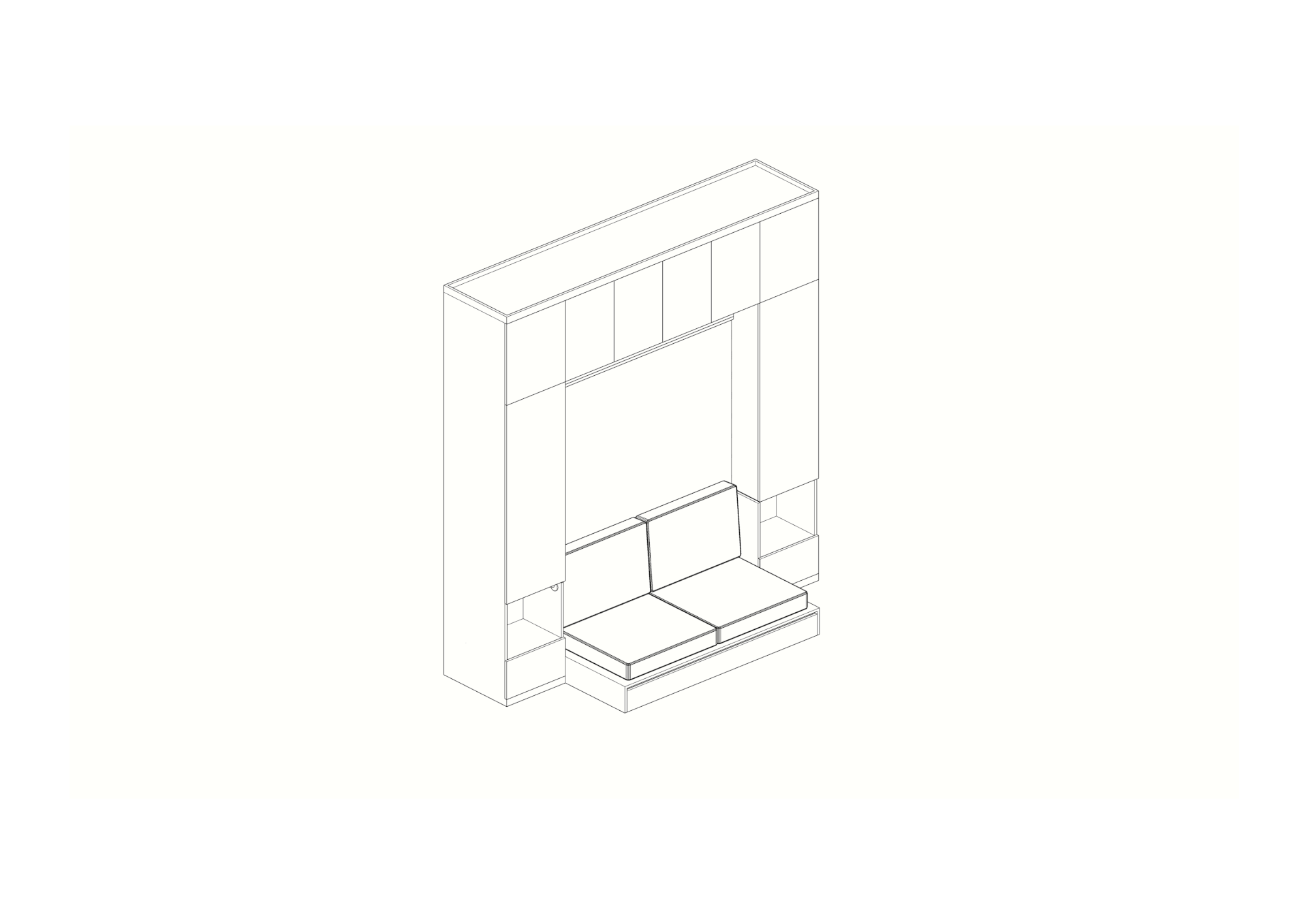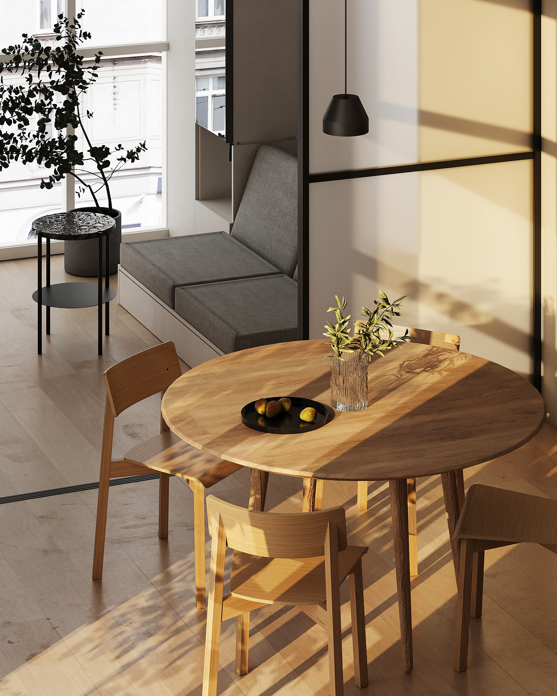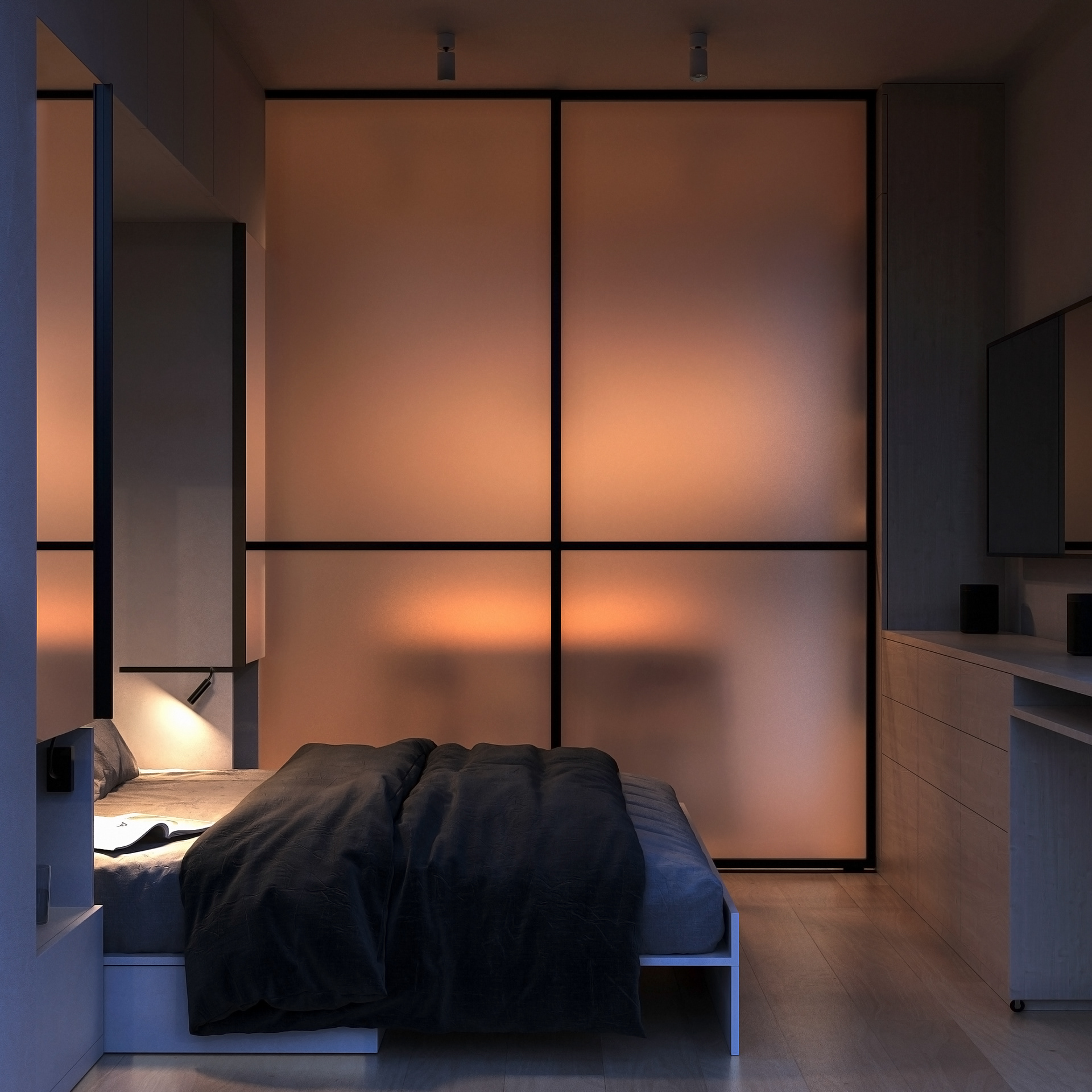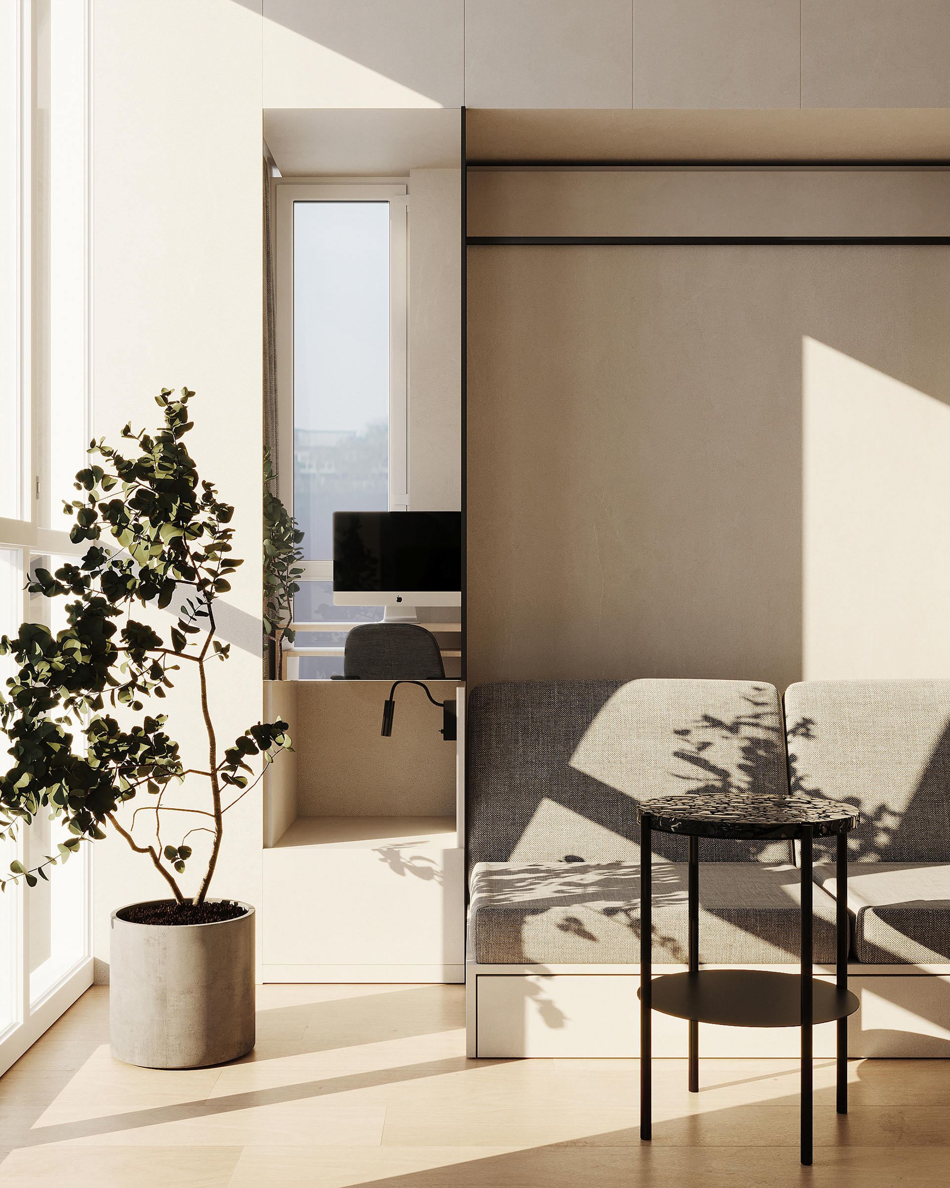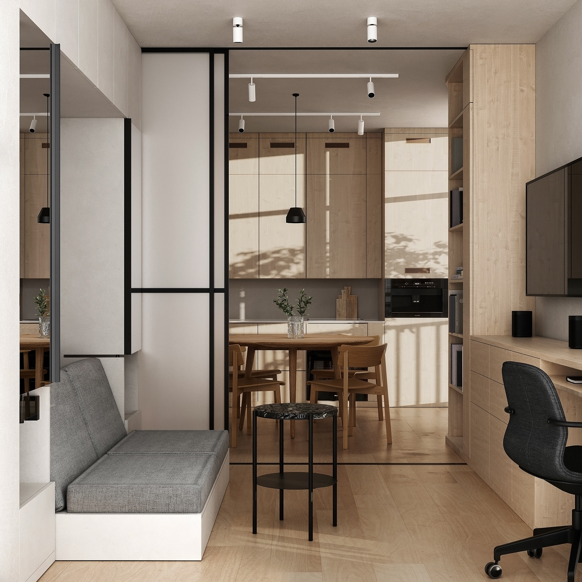 A tiny apartment for a young couple planning a child. Transforming furniture creates individual rooms for parents and a child and provides a spacious common area.