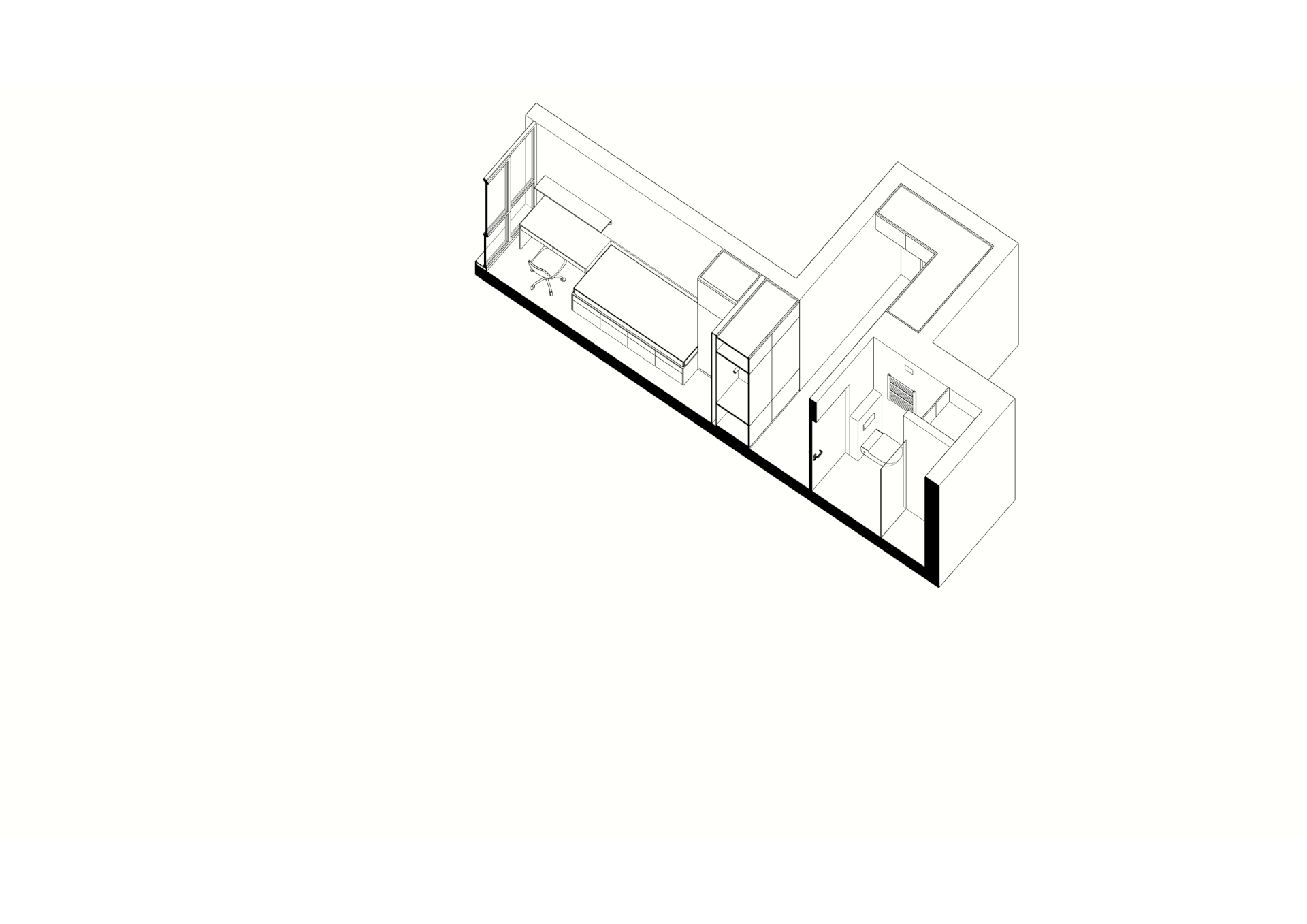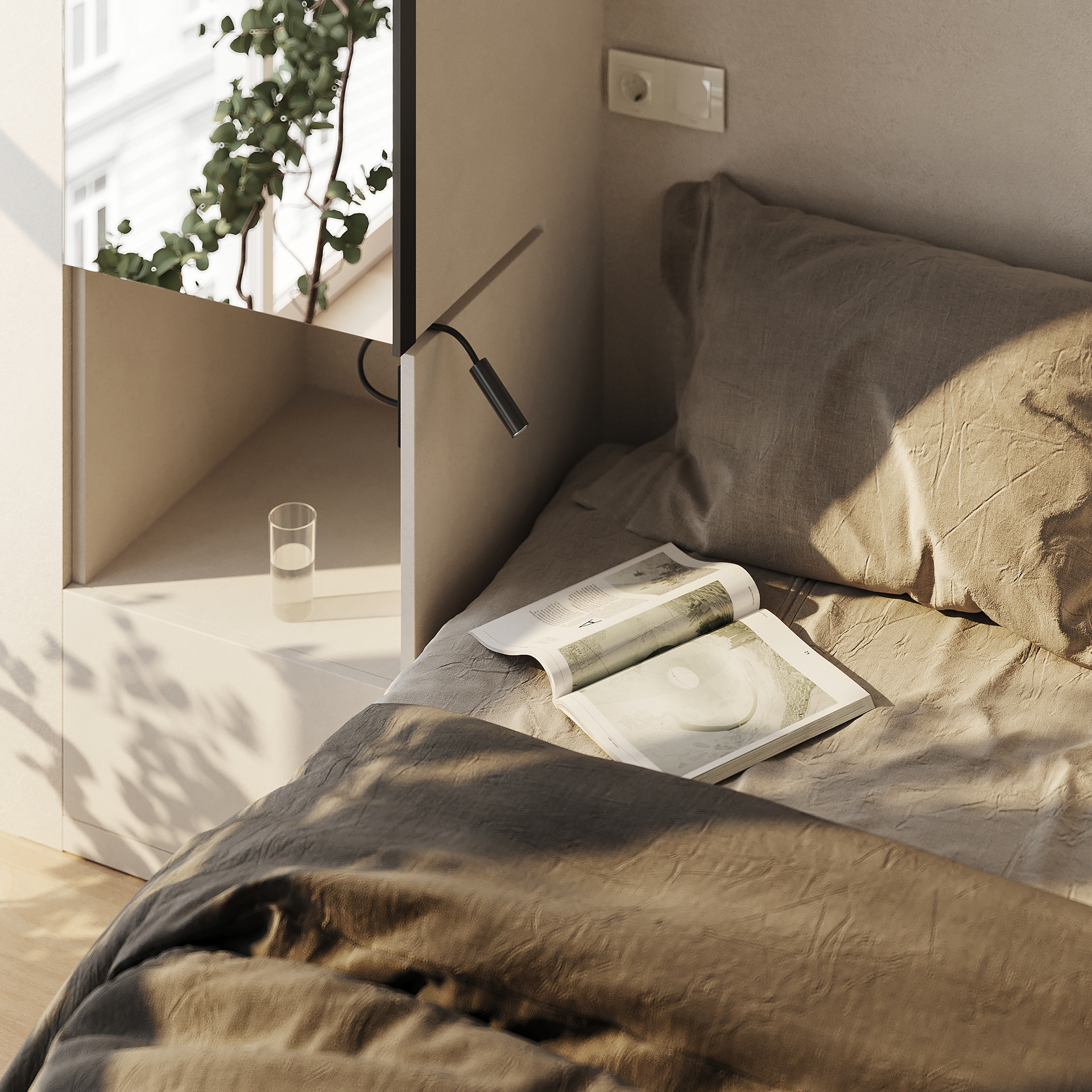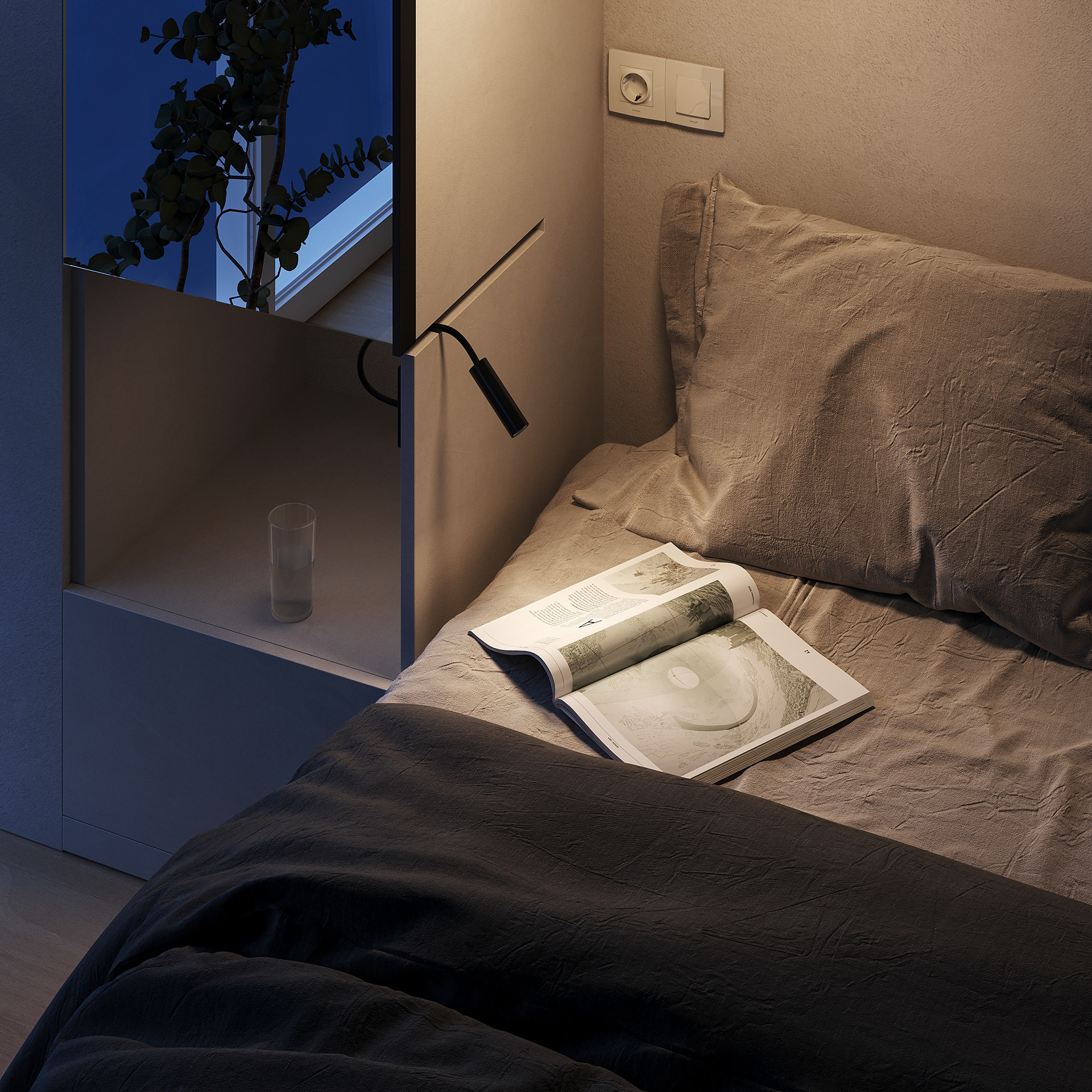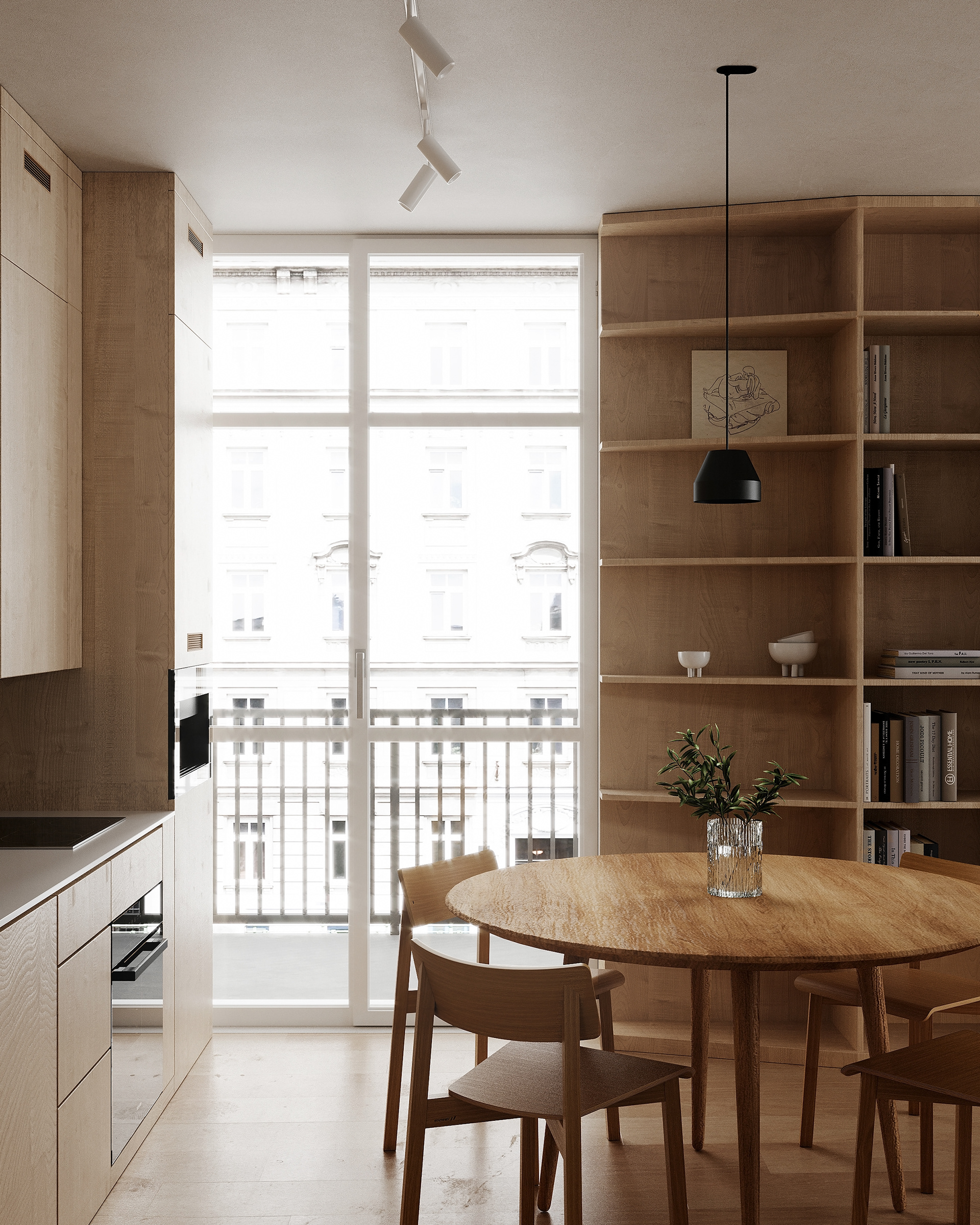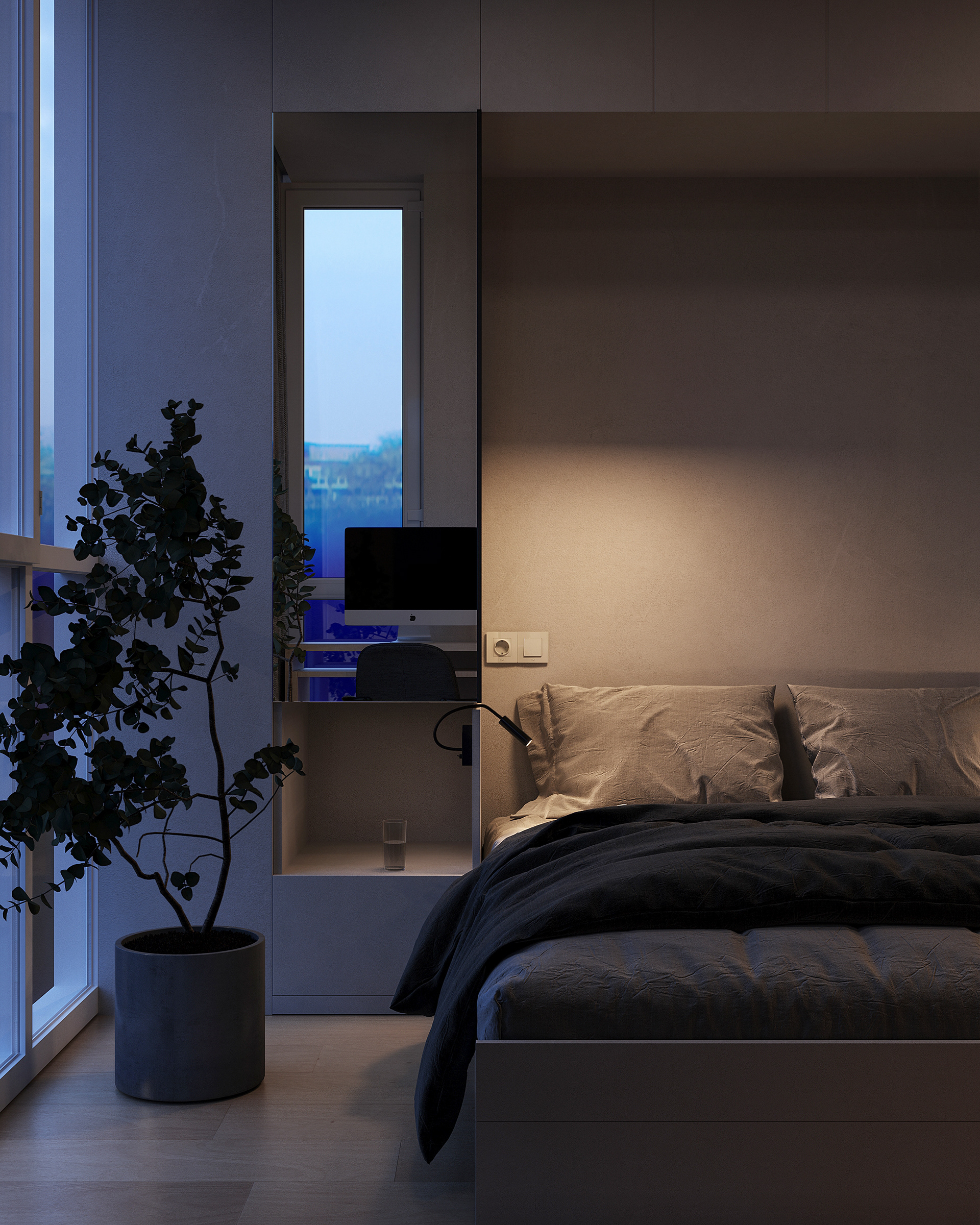 A tiny apartment for a young couple planning a child. Transforming furniture creates individual rooms for parents and a child and provides a spacious common area.