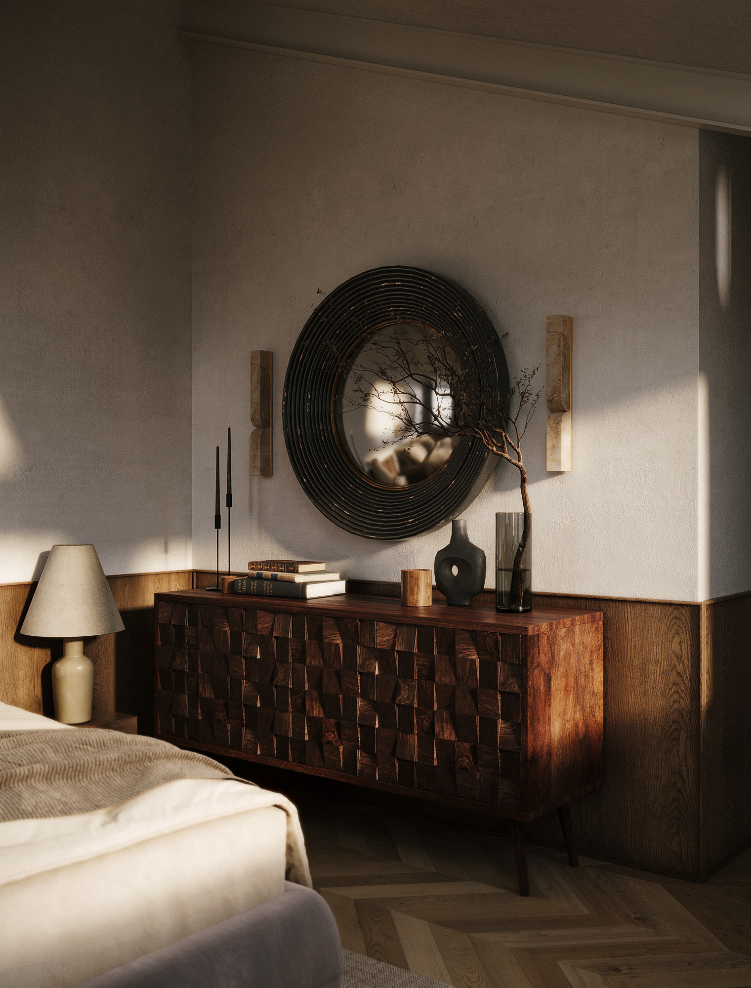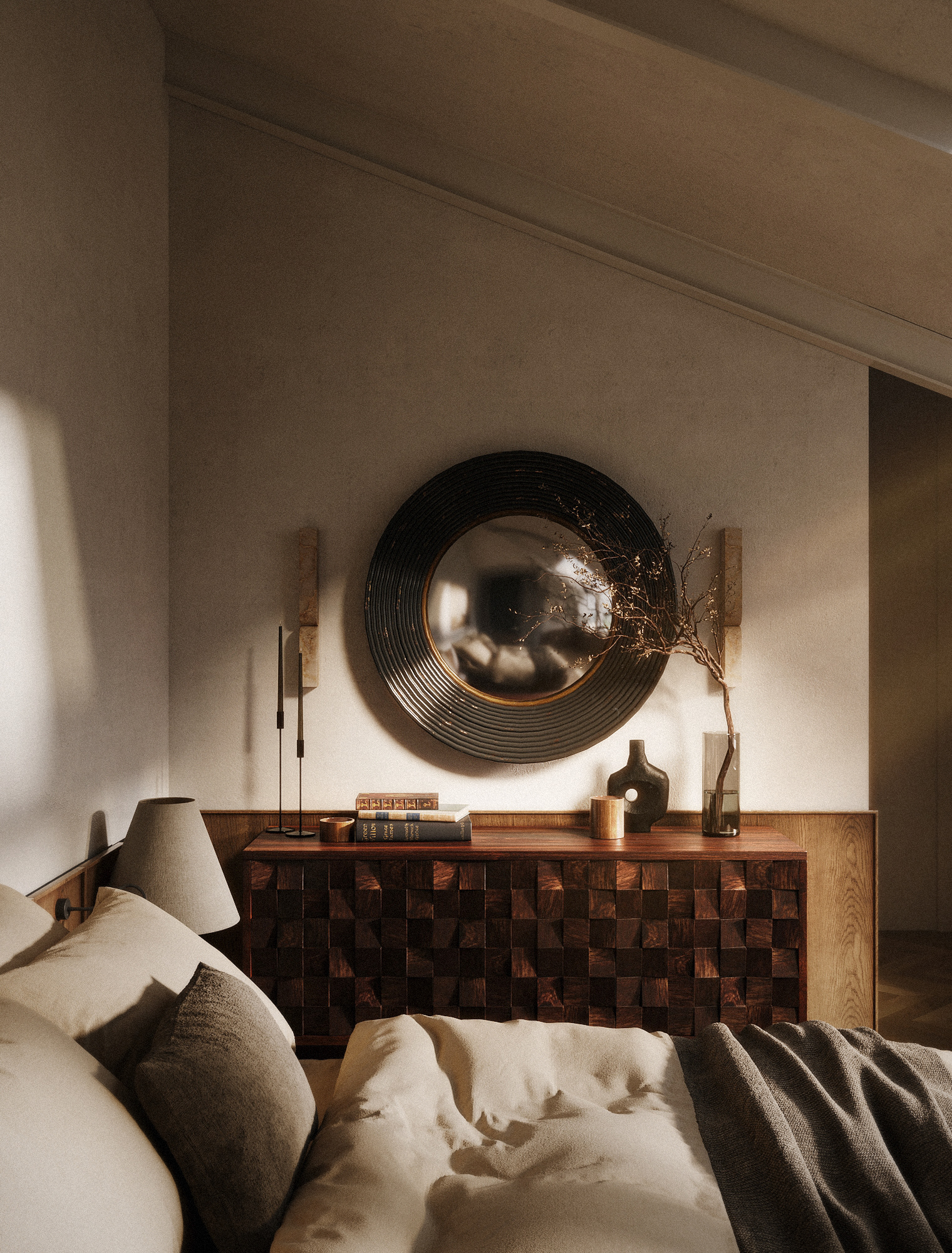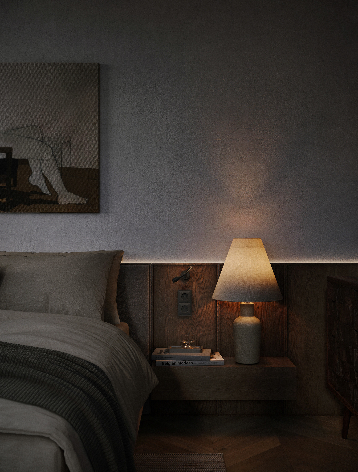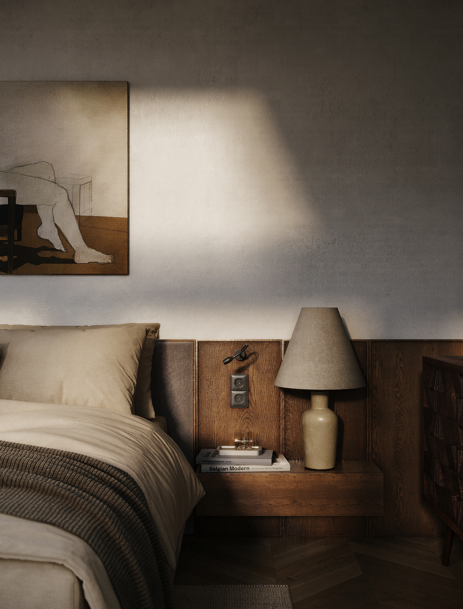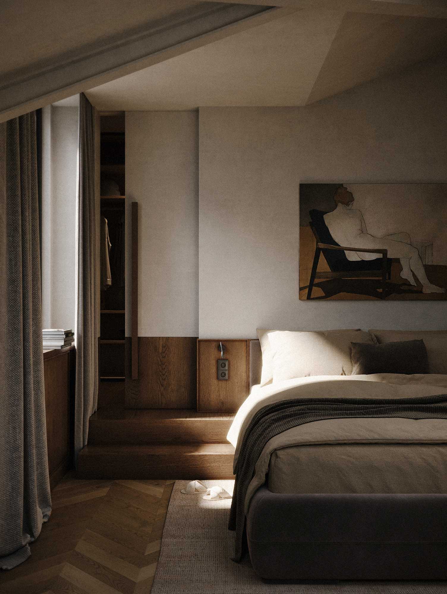 Small wooden bedroom with an attic roof. The unusual arrangement of the windows allows you to get a beautiful pattern of light and shadow. The cozy atmosphere was created by specific room shape and a lot of wooden material